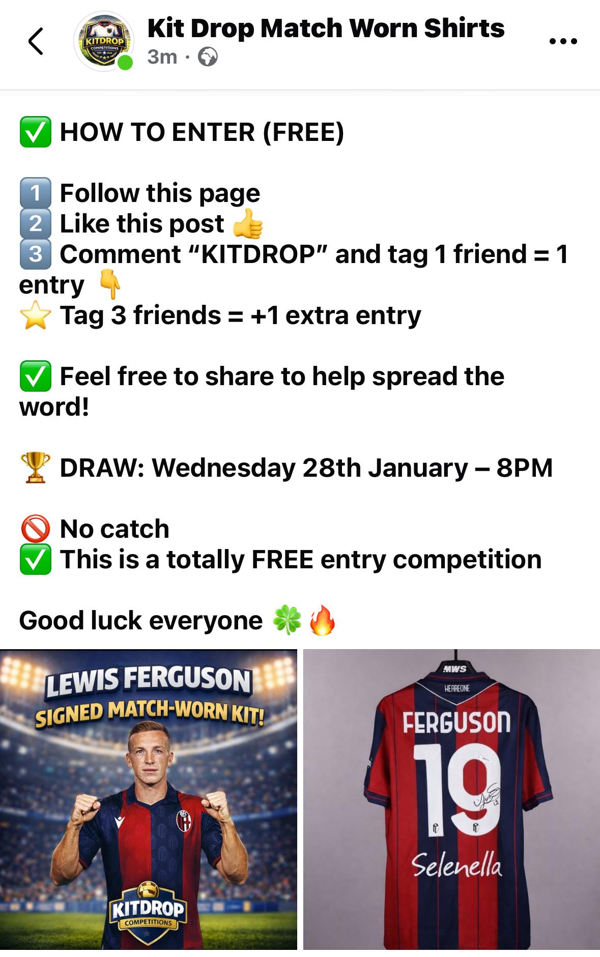 Kit Drop Match Worn Shirts Posted January 20 Posted January 20 If you fancy chance to win Scottish International Lewis Ferguson’s signed Match Worn shirt v Bologna head to Facebook and Kit Drop Match Worn shirts for a free entry draw. Quote